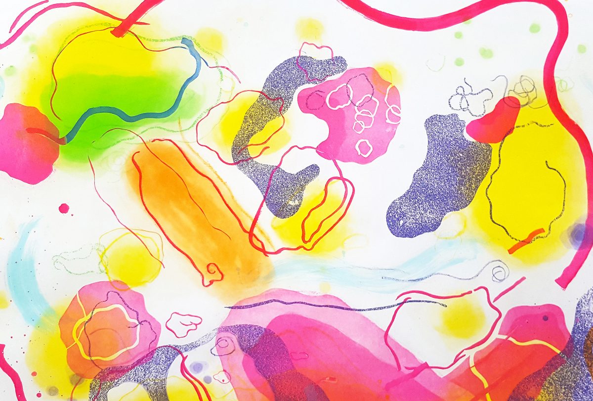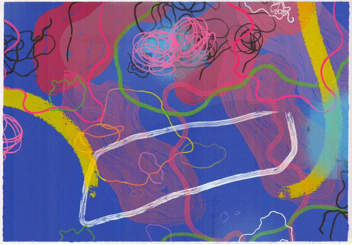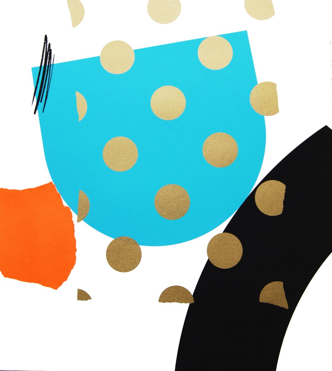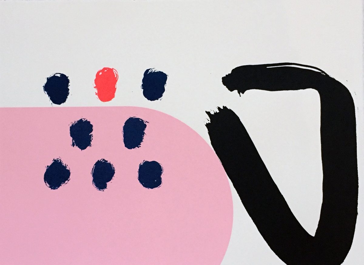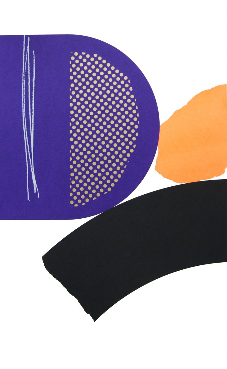 A range of individualised colourful gestures distinguish Aoife Scott’s screenprints. Each painterly mark is placed judiciously across an expansive flatly coloured background. There is a musical quality present; each colourful element is choreographed to augment the other. – Dr Angela Griffith, Trinity College Dublin.