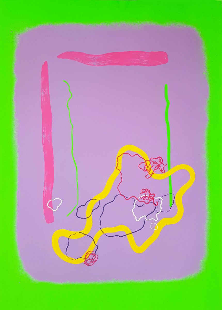 Maser synthesises gestural and mechanical elements in industrial colours to create riotous works that seek to challenge or deny the edges of their composition.