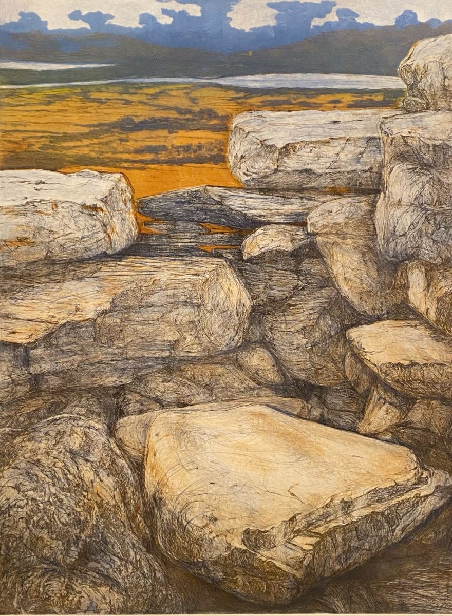 Today, (when artists have more readily access to a photocopier or digital printer than a printing press) printmaking discussions often focus on tradition versus innovation. Yet despite this, it is reassuring to see the numbers of contemporary artists that continue to explore time-honoured methods as an essential part of their practice. The artists on display in this exhibition demonstrate a range of approaches in etching; from the creation of finely-drawn introspective works, to richly coloured painterly compositions, to explorations of memory through photographic means. Each of these artists was invited to work on a relatively large scale, signifying their ambitious intent for both the process and content of their work.