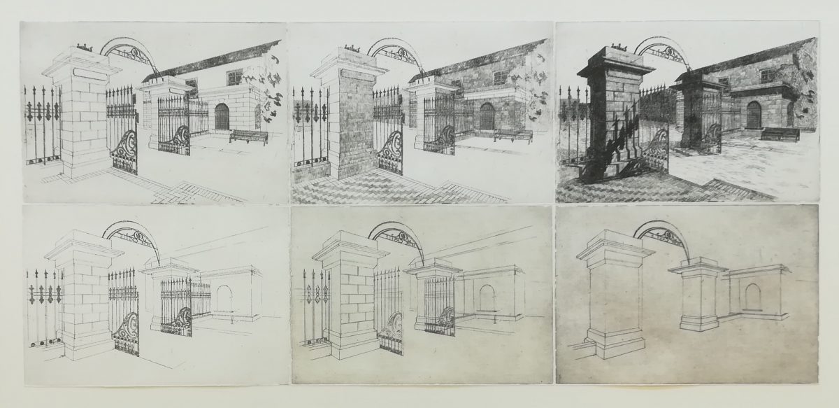 The New State: contemporary etching in Ireland provides a platform for early career printmakers – each of the artists involved have come to medium within the last five years. A range of approaches is visible in terms of content, presentation and finish. A number of artists have looked to urban themes. Vaida Varnagiene’s stark and monumental images of Dublin architectural landmarks are presented as belonging to an anonymous international metropolis. These are in contrast with the shadowed descriptive treatment of the city’s suburbs by Ned McLoughlin. The rhythmic graphic beauty of the industrial space, presented in a multifaceted and fractured from by Ria Czerniak-Lebov diverges from Julie Ann Haines painterly and sweeping treatment of Dublin’s coast line which is dominated by chimney stacks at the Poolbeg Generating Station. Eimhin Farrell’s linear study of the historic Hope Castle Gates in Castleblaney comprises a series of states, navigating the viewer through the artist’s process of constructing a composition.