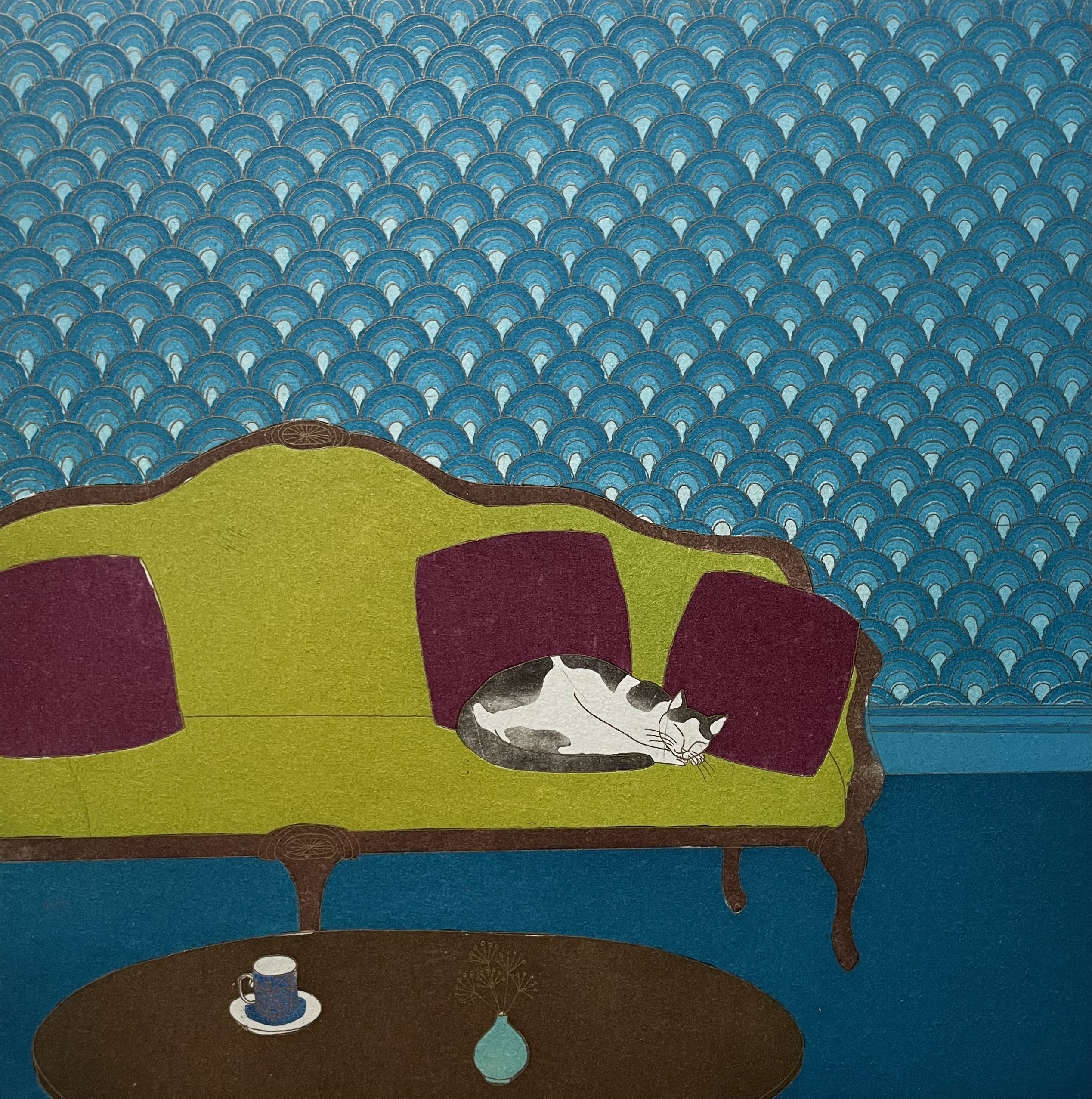 Yoko Akino’s prints balance vivid colour with patterned line, encompassing interiors, cats, seascapes, and symbolic motifs. The poignancy of titles such as When you believe, there it is, and An Bradán Fease point to moments of awareness and transformation. Pattern, rhythm, and subtle shifts of tone structure her compositions, drawing attention to the interplay between form and space to create a sense of reflection and wonder. The work carries an interest in perception, impermanence, and insight through attention.